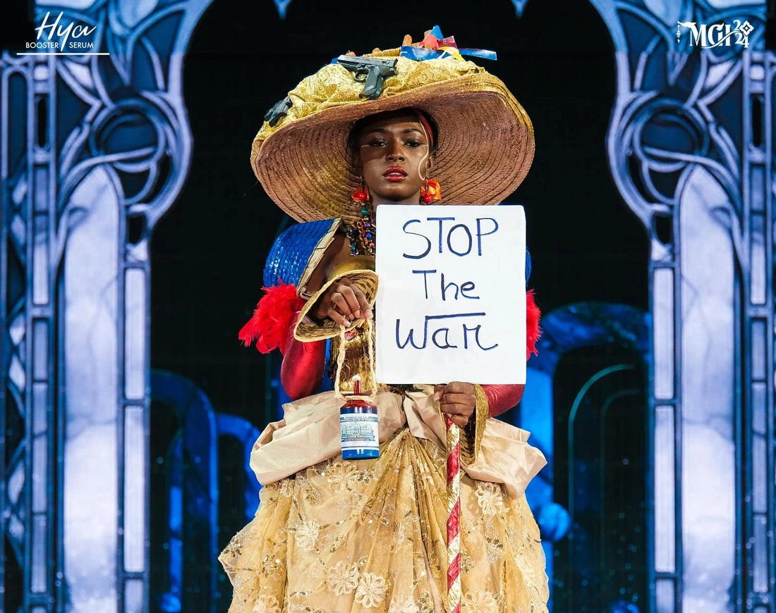 Phần trình diễn trang phục dân tộc trong khuôn khổ cuộc thi Hoa hậu Hòa bình Quốc tế 2024 (Miss Grand International) gây chú ý với thông điệp kêu gọi ‘chấm dứt chiến tranh’ của người đẹp đến từ Haiti.